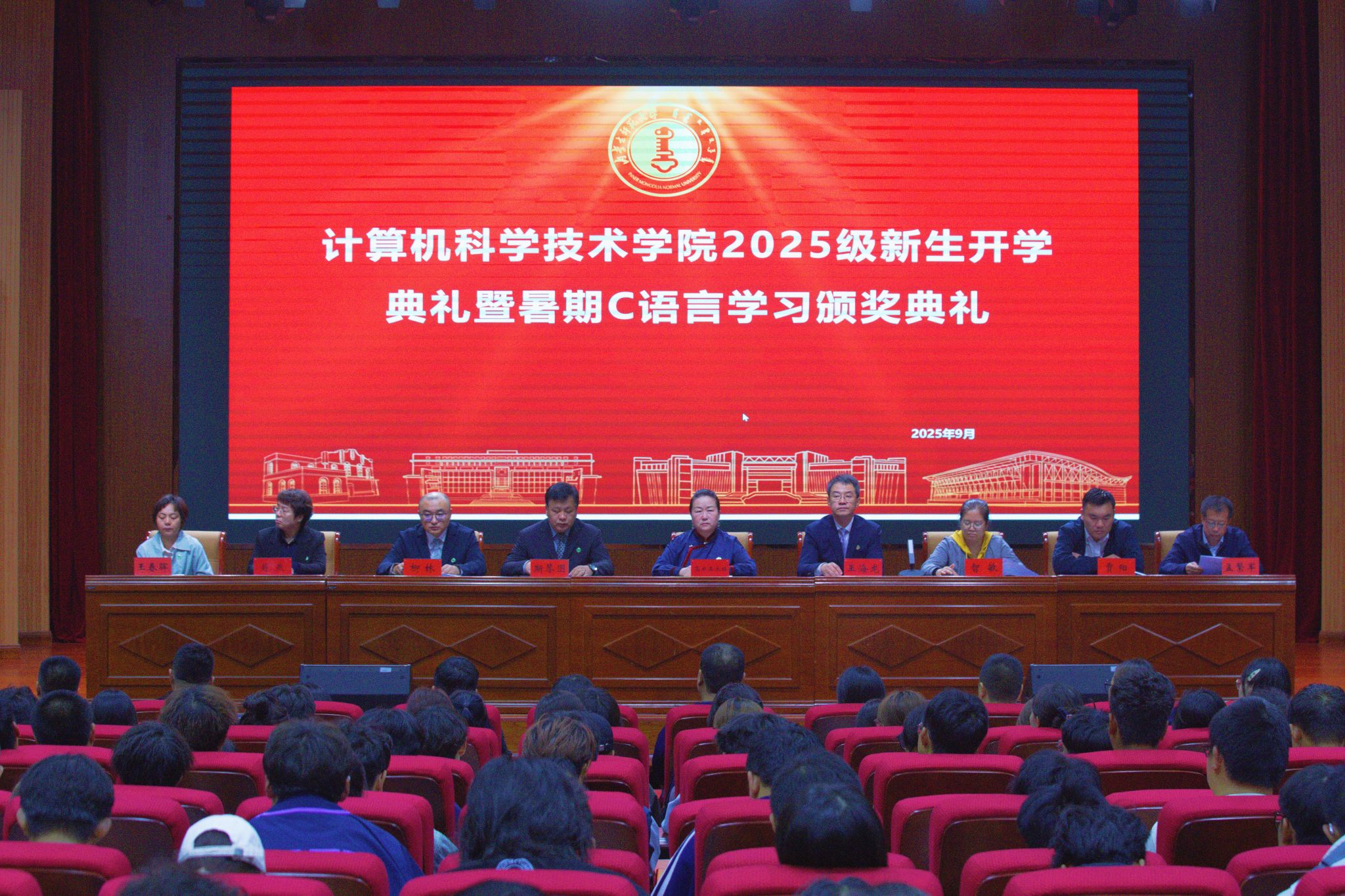 9月27日,太阳成集团tyc41183举行2025级本科生开学典礼暨暑期C语言学习颁奖典礼在盛乐校区图书馆报告厅举行,共迎358名2025级本科新生。学院党委书记乌日其木格,院长王海龙,副院长斯琴图、智敏、柳林、贾阳出席开学典礼,各系部负责人、辅导员、新生班主任参加开学典礼,典礼由副院长柳林主持。