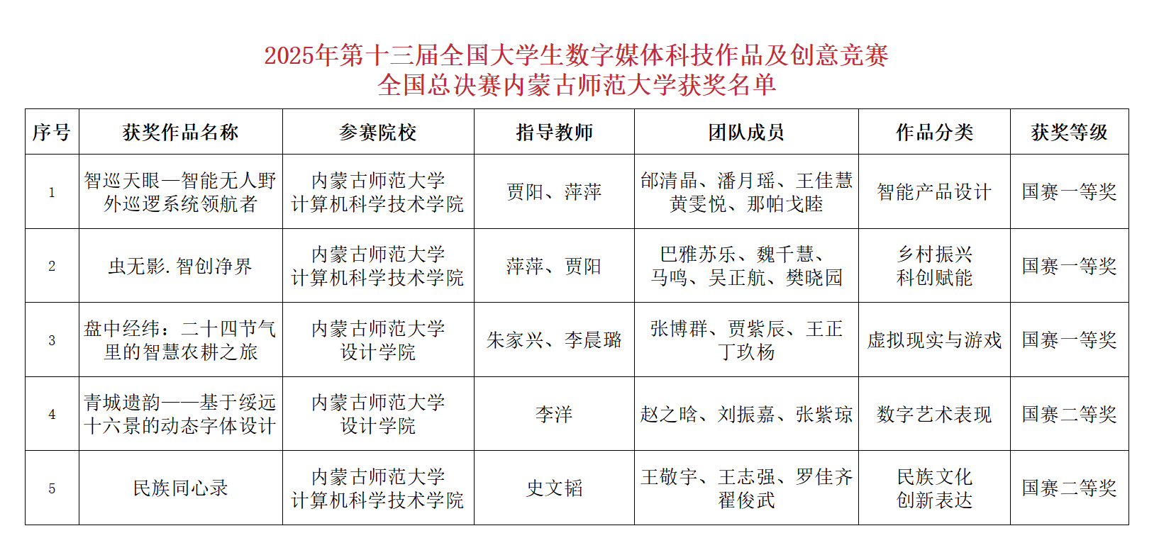 2025年10月24日至26日,第十三届全国大学生数字媒体科技作品及创意竞赛全国总决赛在哈尔滨工业大学成功举办。我院学子在本届赛事中表现优异,共摘得全国一等奖2项、二等奖1项,充分展现了我院在“人工智能+数字媒体”领域扎实的育人水平和人才培养成效。