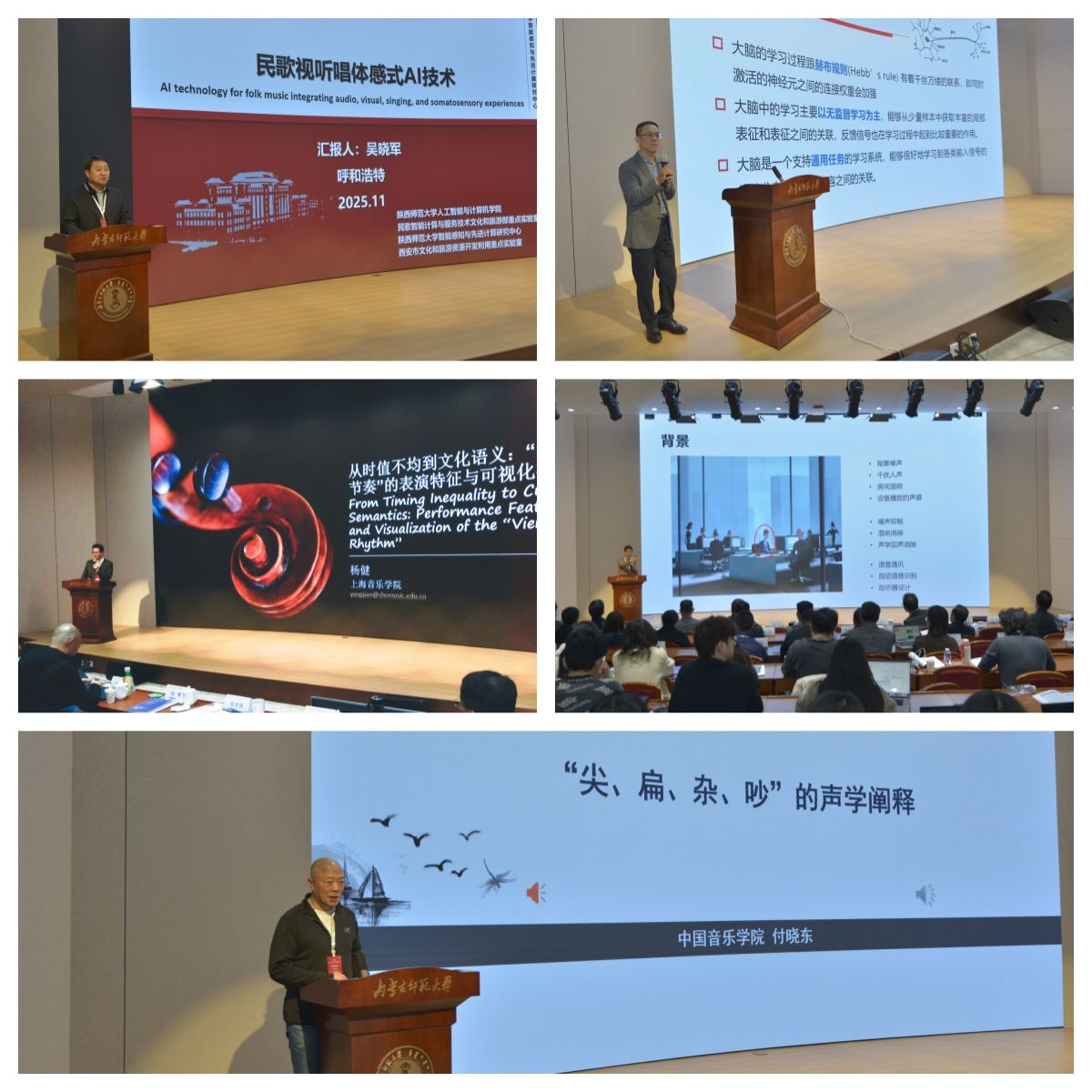 主旨报告揭示未来方向:五场大会主旨报告构成了会议的理论高地。中国音乐学院付晓东教授对民族管弦乐队“尖、扁、杂、吵”音响特征的声学阐释,为传统音乐美学提供了量化支撑;陕西师范大学吴晓军教授展示了融合多模态AI的民歌体感式视听唱系统,开辟了文化遗产活态传承的新路径;上海音乐学院杨健教授通过“维也纳节奏”的可视化研究,揭示了音乐表演与文化语义的深层关联;复旦大学张文强研究员阐述了音视频信息在具身智能学习发育中的关键作用;内蒙古大学张学良教授则深入剖析了知识与数据驱动在语音信号处理中的融合优势。
