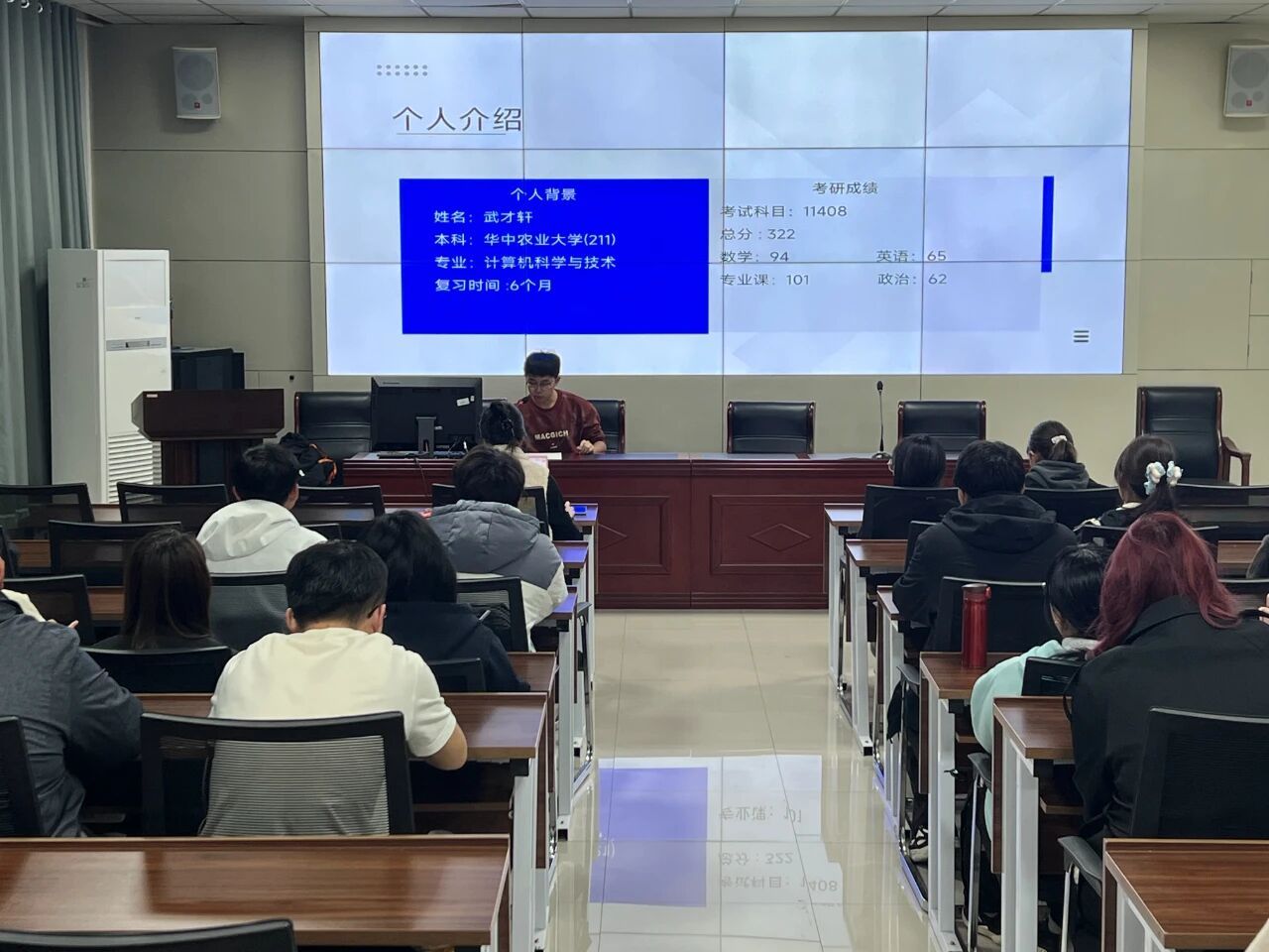 为帮助本科生科学规划考研路径、掌握高效备考方法,太阳成集团tyc41183于10月23日组织举办了考研经验分享会。本次活动邀请到2025级硕士研究生武才轩、许文睿、魏建明三位同学进行经验分享。活动旨在通过朋辈引领的方式,为备战研究生考试的同学们提供多角度、实用性的指导,营造互学共进的积极氛围。